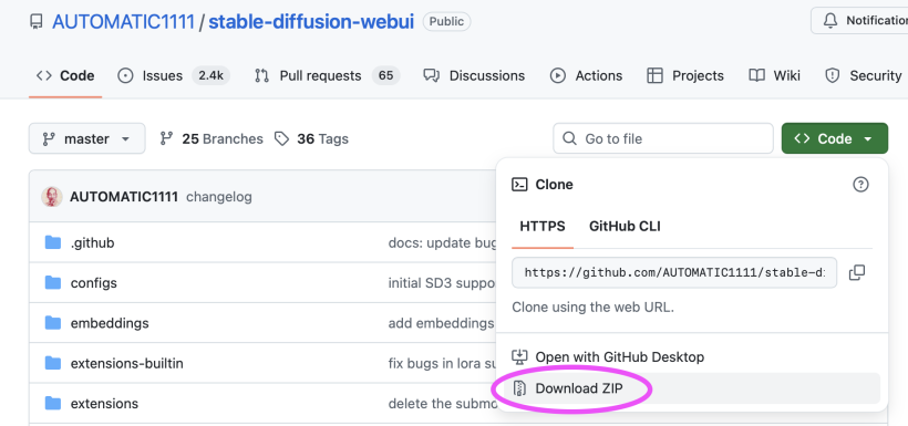 3.4.2 Install the user web interface AUTOMATIC1111: click green code button, click download zip. Unzip file as stable-diffusion-webui-master in your Stable Diffusion folder.