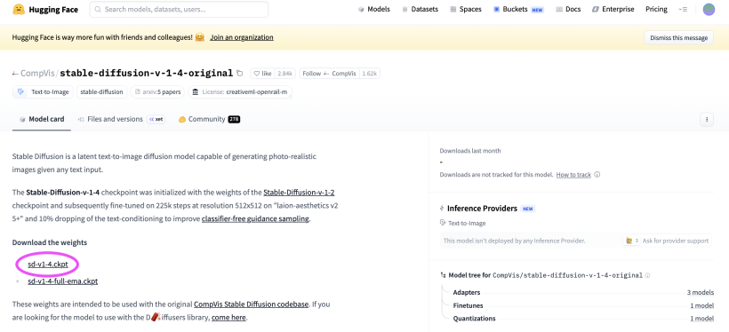 3.4.4 Download checkpoint sd-v1-4.ckpt von HuggingFace and put the file in folder: StableDiffusion/stabeldiffusionwebuimaster/models/Stable-diffusion/.