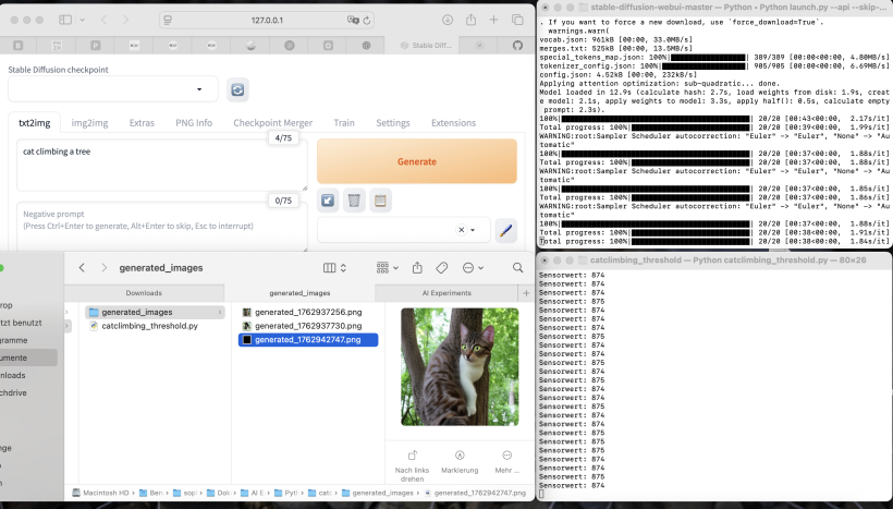 This Python code sends your prompt to Stable Diffusion when a threshold (a certain sensor value) is reached. The trigger can be activated again when the value crosses the threshold once more.