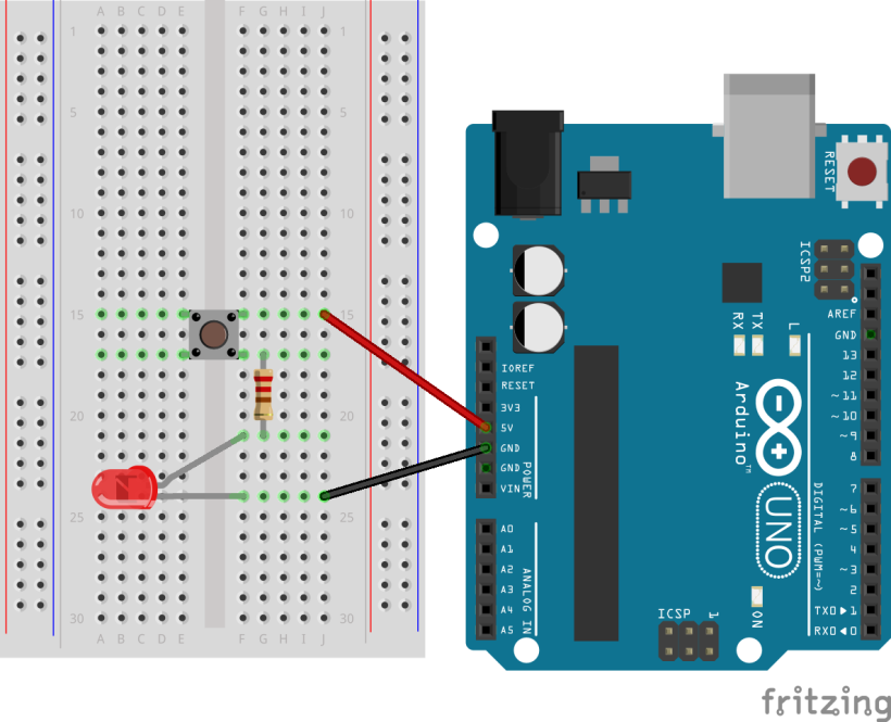 Long leg of the LED must be connected to 5V, short leg of LED is connected to GND. It does not matter where push button and resistor are being placed.